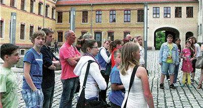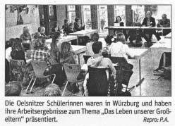 Die erste Reise ist schon Geschichte. Anfang Oktober waren die Schülerinnen der Klassen 7 und 8 Manja Hendel, Selina Weiß, Annalena Riedel und Sarah Steinbach mit Sylvia Peterhänsel, Schulkoordinatorin des Comenius Projektes an der Oelsnitzer Bildungsstätte und Pädagoge Ulrich Weigel zu Gast in Würzburg. In Arbeitsgruppen beschäftigten sie sich an vier Tagen mit dem Thema „Das Leben unserer Großeltern" und erarbeiteten dazu Fakten zum Alltag um die Jahrhundertwende bis zirka 1950. Den Abschluss bildeten Präsentationen in Form eines Jugendparlaments.