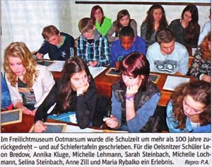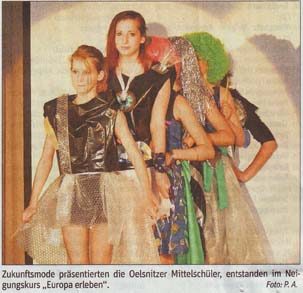 Oelsnitz – Kommende Woche begrüßt die Mittelschule Oelsnitz alle am Comenius-Projekt beteiligten europäischen Schuldelegationen, wir berichteten mehrfach. Am Dienstag, 11. Juni, sind auch die Bürger aus Oelsnitz und Umgebung eingeladen, wenn ab 9.20 Uhr in der Aula eigene Filme der Schüler zum Thema „Das Leben unserer Großeltern“ gezeigt werden. Hereinspaziert heißt es an gleicher Stätte auch ab 13.45 Uhr zur Modenschau. Traditionelle als auch fiktive Kleidungen werden vor Augen geführt.