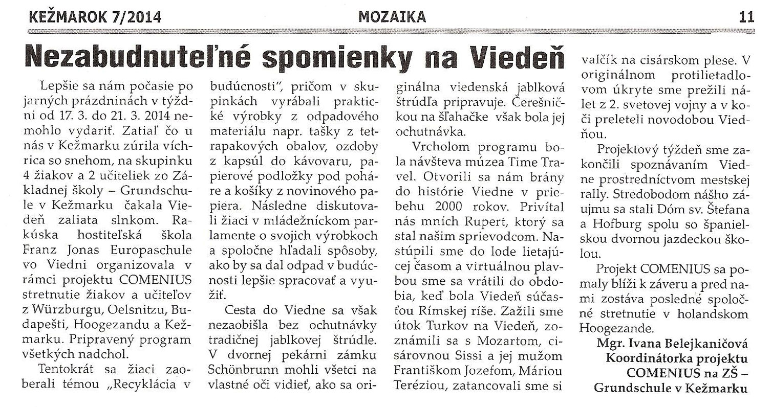 Besser hätte es der Wettergott in der Woche vom 17. März bis zum 21. März nicht einrichten können! Bei strahlendem Sonnenschein begab sich eine kleine Schülergruppe der Oberschule Oelsnitz, begleitet von Frau Penzel und Frau Peterhänsel, auf die Reise nach Wien und erlebte dort eine beeindruckende Woche. Die österreichischen Gastgeber der Franz- Jonas- Europaschule organisierten für das COMENIUS- Treffen ein tolles Programm, das alle begeisterte.