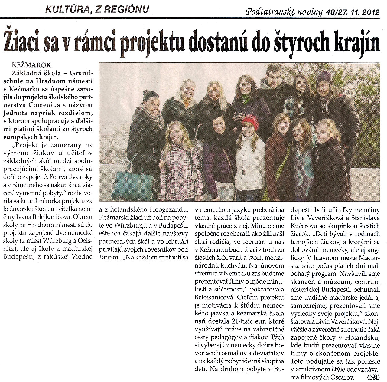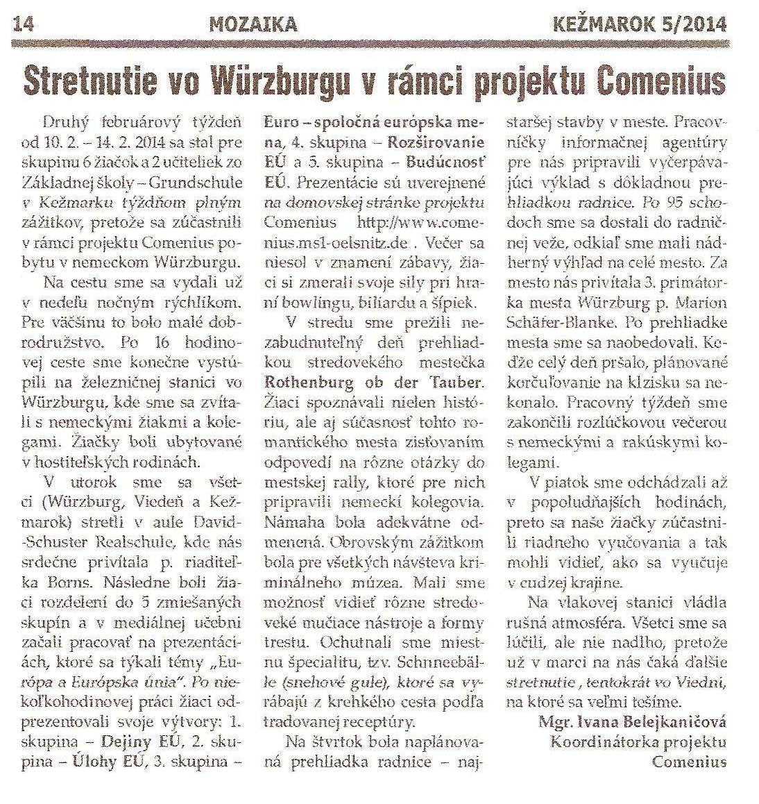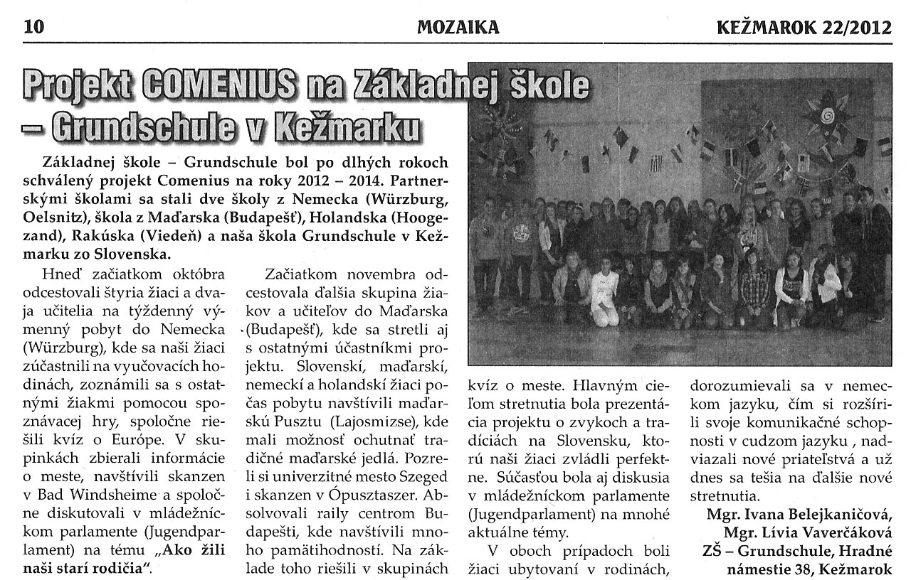 Am Dienstag trafen sich die Comenius-Schüler der sechs teilnehmenden Schulen (Kezmarok, Budapest, Wien, Würzburg, Oelsnitz, Hoogezand) und starteten gemeinsam mit ihren Lehrern in eine erlebnisreiche Woche. Diese begann mit der Vorführung der von den Schülern selbst erstellten Filme zum Thema „Wir vereinigen uns!“. Nach einer Stadtrallye und der Besichtigung der Burg in Kezmarok konnten alle ihr Geschick beim Kart-Fahren unter Beweis stellen. Außerdem wurden Sehenswürdigkeiten der Slowakei besichtigt. Besonders beeindruckend waren die Tropfsteinhöhle in Vazec und das Freilichtmuseum in Liptovska. Kreativität war ebenso gefragt. Zum Thema „Stadt der Zukunft“ gestalteten sechs Schülergruppen Modellbauten, welche im Rahmen des Jugendparlamentes vorgestellt und erläutert wurden.