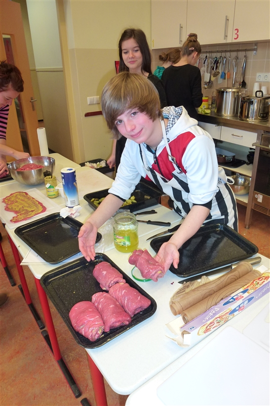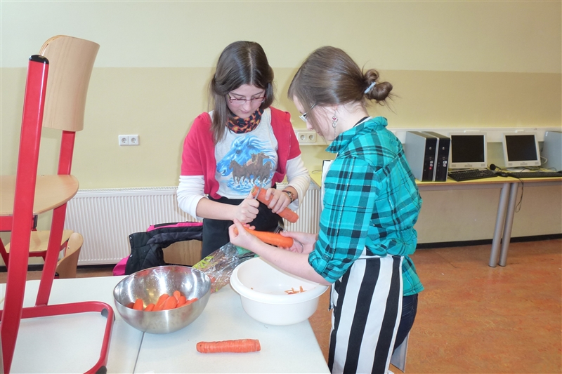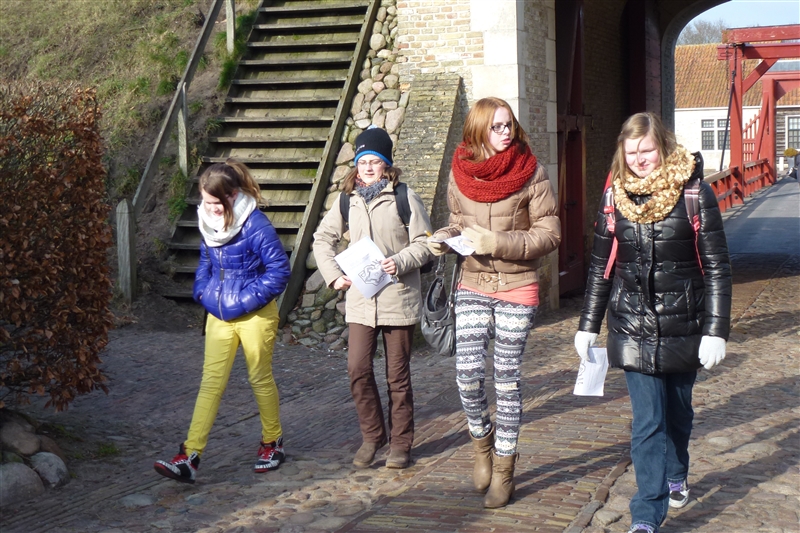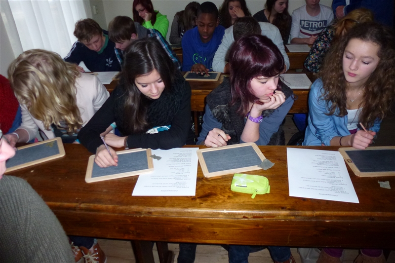 Die Provinzhauptstadt Groningen lernten wir während einer Fotosafari kennen. Ein Tag stand ganz im Zeichen des Lehrens und Lernens, alle erlebten im Freilichtmuseum Ootmarsum eine Schulstunde aus der Zeit um 1900, konnten probieren, wie man mit einem Griffel auf eine Schiefertafel schreibt und wie sich der Unterricht bis in die heutige Zeit verändert hat. Am letzten Tag unseres Aufenthaltes vermittelte Frau Peterhänsel in zwei Unterrichtsblöcken den niederländischen Schülern einen Eindruck vom Leben in der DDR und von den Ereignissen der Wendezeit. Zeitgleich beschäftigten sich die Schüler aus Oelsnitz noch einmal mit dem Leben am Deich, bevor am Nachmittag von allen teilnehmenden Kindern ein 3- Gänge- Menu gekocht wurde. Anschließend wurde gemeinsam gegessen. Jedes Land hatte eine Vorspeise, ein Hauptgericht und eine Nachspeise zubereitet, so dass es ein reichhaltiges Angebot gab. Alle waren begeistert und fanden das Essen besonders „lekker“. Mit vielen Gastgeschenken der niederländischen Familien im Gepäck und unvergesslichen Eindrücken ging es am 1. März wieder auf die Heimreise.